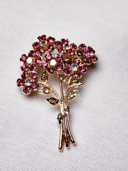 Pembe Taşlı Çiçek Demeti Figürlü Broş – Işıltılı Gold Aksesuar