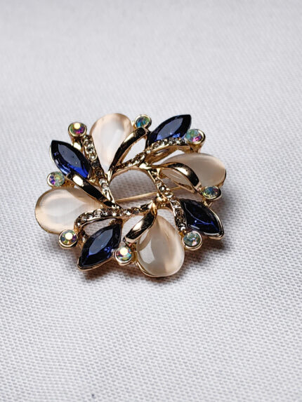 Lacivert ve Sedef Taşlı Çiçek Formlu Broş – Şık Aksesuar