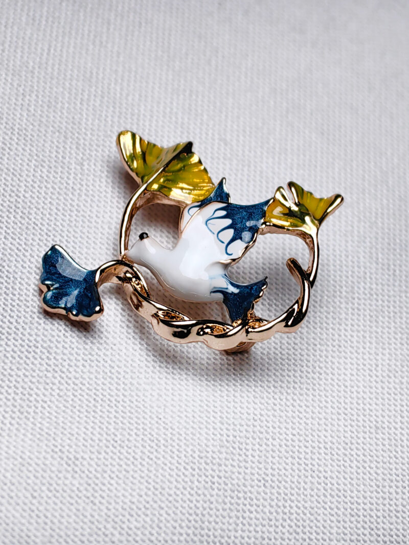 Sadelik ve doğallığın simgesi olan bu beyaz kuş figürlü broş, altın tonlu dallar ve sarı-mavi yaprak detaylarıyla tamamlanarak zarif bir görünüm sunuyor. El işçiliğini andıran detayları ve emaye renk geçişleri sayesinde kombinlerinize estetik ve huzur dolu bir dokunuş katar.