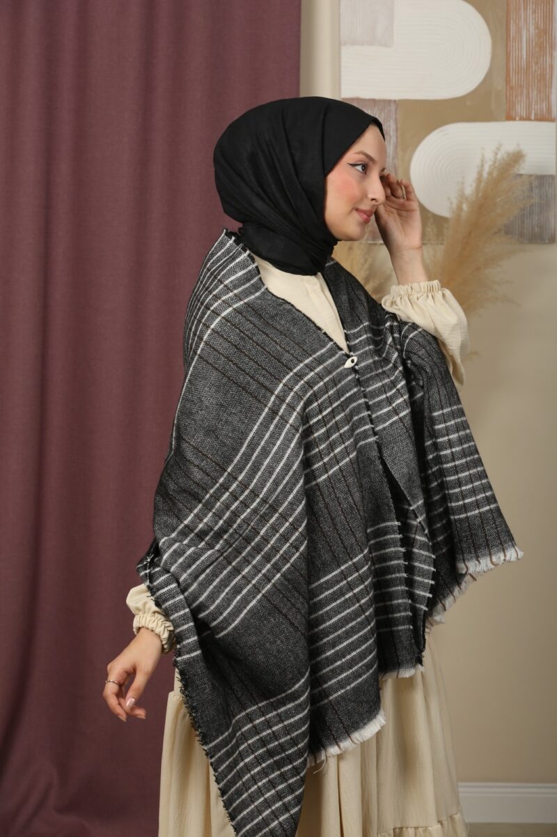 Hem klasik hem de modern giyim tarzına uyum sağlayan bu şal, farklı kombinlerde çok yönlü bir kullanım sunar.