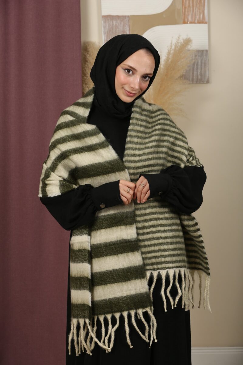 Şıklığı ve konforu bir arada sunan çift taraflı çizgili omuz şalı, günlük kombinlerinize modern bir dokunuş katar. Yumuşak dokusuyla serin havalarda sizi sıcak tutarken, hafif yapısı sayesinde gün boyu rahat kullanım sağlar.