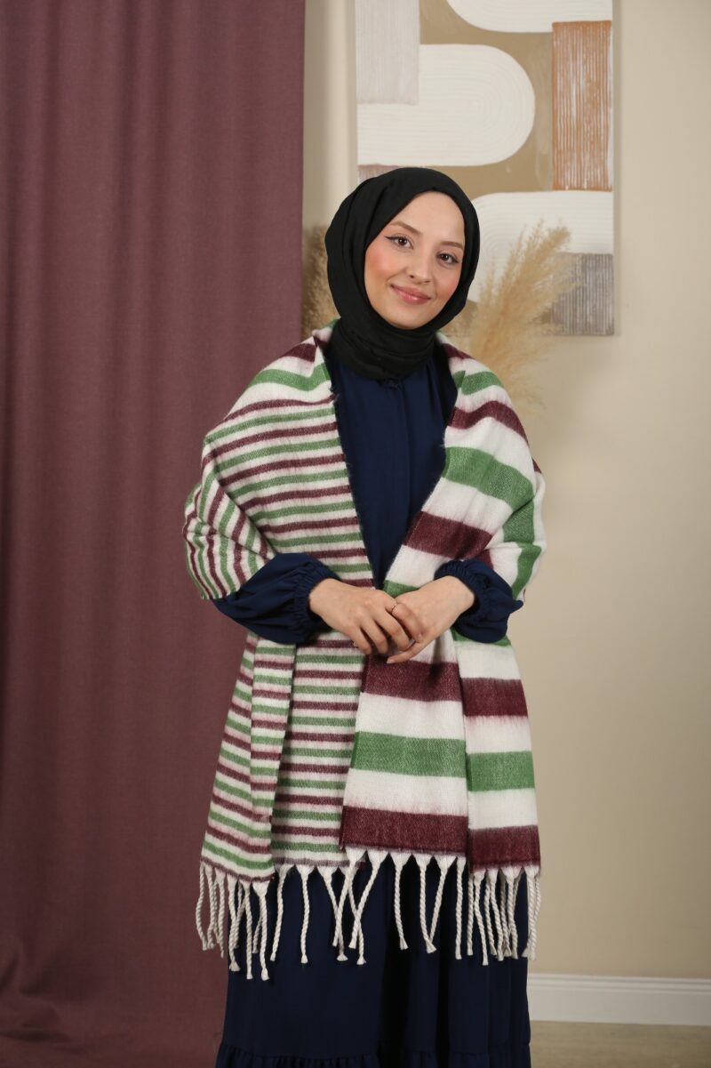 Şıklığı ve konforu bir arada sunan çift taraflı çizgili omuz şalı, günlük kombinlerinize modern bir dokunuş katar. Yumuşak dokusuyla serin havalarda sizi sıcak tutarken, hafif yapısı sayesinde gün boyu rahat kullanım sağlar.
