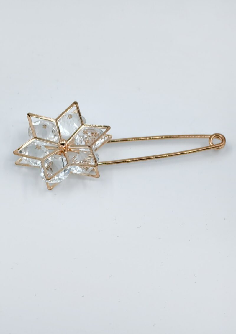 Kristal taşlarla bezeli yıldız formundaki bu şık broş, şal ve eşarp kombinlerinize zarafet katmak için tasarlandı. Hafif yapısı sayesinde kolayca takılır, altın renkli zarif metal gövdesi ise tüm tonlarla uyum sağlar.