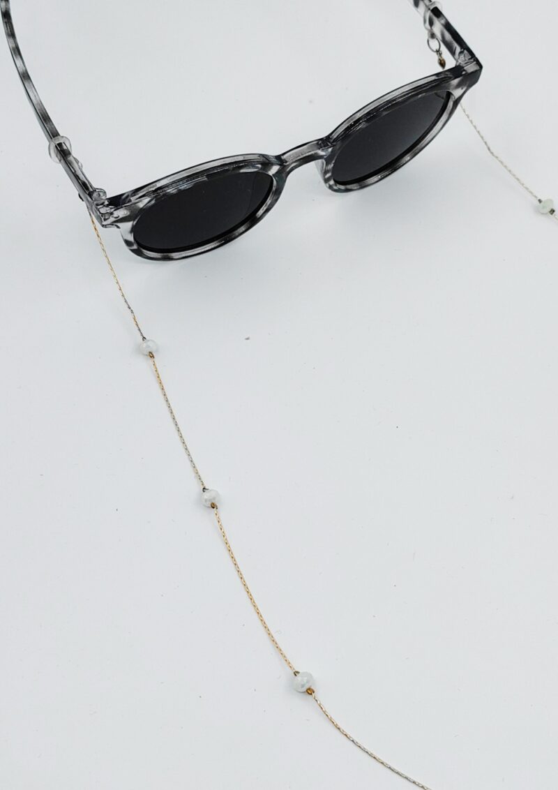 Altın renkli ince zinciri ve aralıklı parlak boncuk detaylarıyla tasarlanmış bu gözlük askısı, hem fonksiyonel hem de estetik bir tamamlayıcıdır.