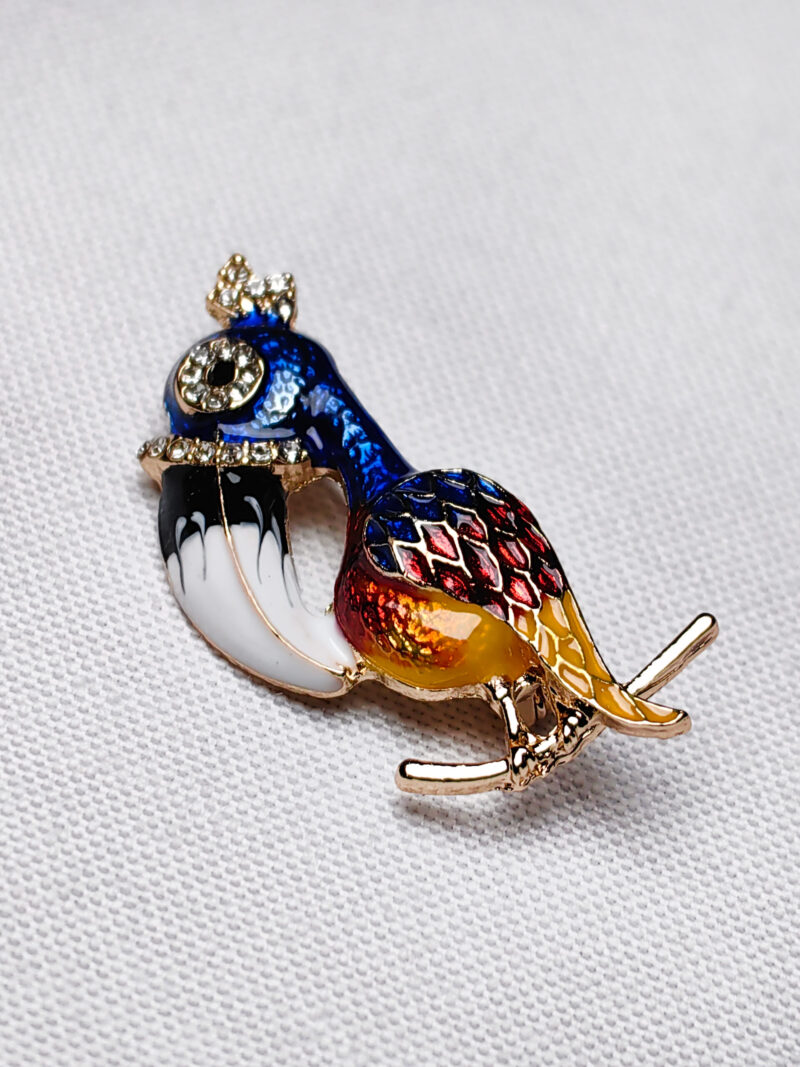 Canlı renk tonları ve dikkat çekici detaylarıyla tasarlanmış bu kuş figürlü broş, stilinize özgün bir dokunuş katmak için ideal bir seçim. Mavi, kırmızı, sarı ve siyah tonlarının göz alıcı uyumu ile altın rengi detayların birleştiği bu aksesuar, hem günlük hem özel gün kombinlerinizi tamamlar.