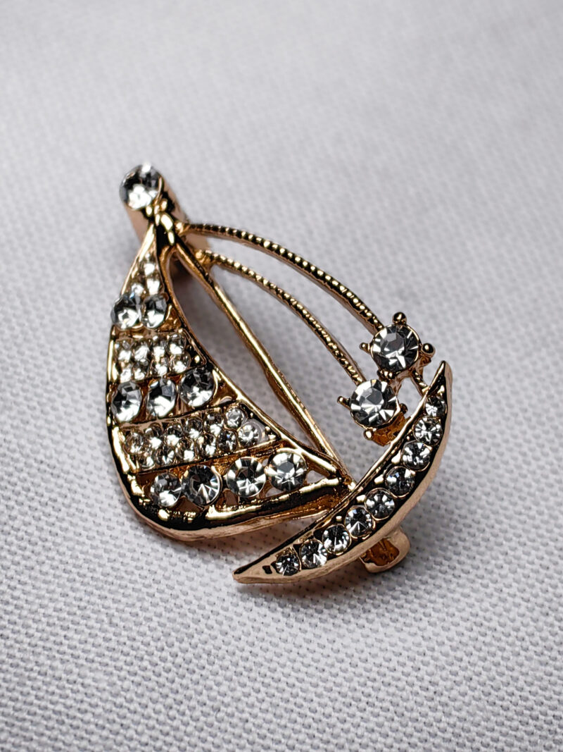 Taş Süslemeli Yelkenli Figürlü Broş – Gold Detaylı Deniz Temalı Aksesuar